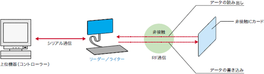 - カード内に、ICチップとアンテナが搭載されており、リーダー/ライターからの微小な電磁波を捉えて動作し通信を行います。カード内に、ICチップとアンテナが搭載されており、リーダー/ライターからの微小な電磁波を捉えて動作し通信を行います。