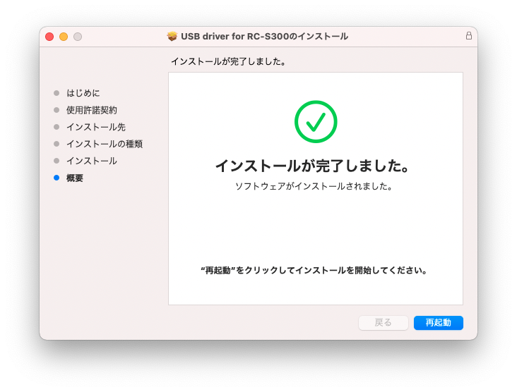 下記メッセージが表示されましたら、右下の「再起動」ボタンをクリックしてMacコンピューターを再起動してください。