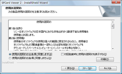 使用許諾契約が表示されますので、内容をご確認の上、同意される場合は「使用許諾契約の全条項に同意します(A)」を選択し、「次へ(N)」をクリックしてください。