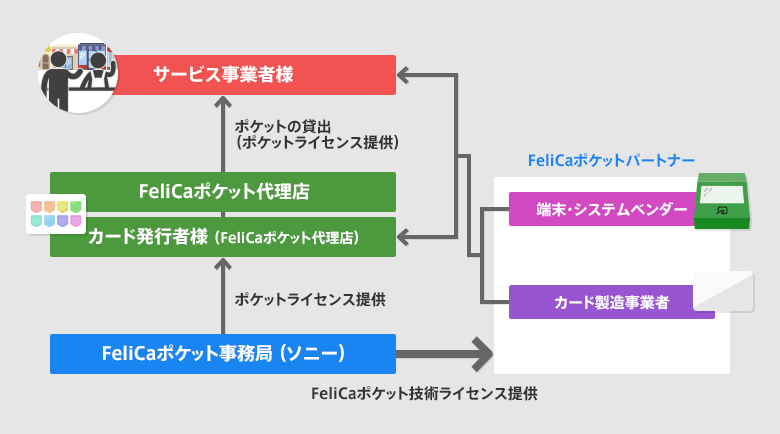 FeliCaポケット搭載カードを発行したいお客様(カード発行者様)、発行済みカードにサービスを追加したいお客様(サービス事業者様)で導入方法が異なります。