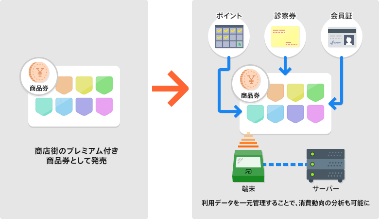 また、利用データを一元管理することで、ポイント、クーポンの導入効果、イベント効果測定、お客様の利用傾向などの分析が可能となり、現状を把握し、今後の施策立案に役立てることも可能です。