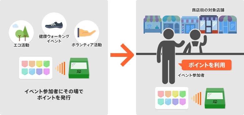 既に利用されているFeliCaポケット搭載カードにサービスの追加・削除が簡単にできるので、地域活動や期間限定イベントにも活用できます。たとえば、期間限定の街中ウォーキングイベントやボランティア活動のインセンティブとしてポイントを発行。商店街でそのポイントをご利用いただくといった仕組み作りが実現できます。