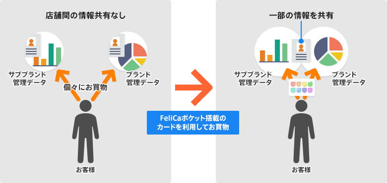 FeliCaポケット搭載の会員証カードにデータを書き込むことで異なる店舗(オフライン)でもデータを共有することが可能になります。