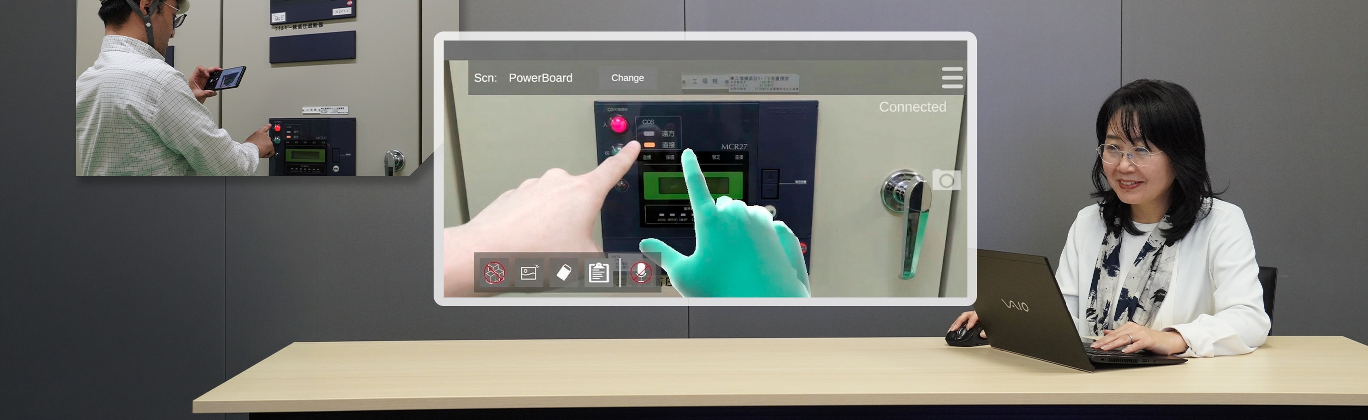 《「遠隔地からの指さし支援」と書かれた矢印が遠隔地から現場に伸びて表示される》