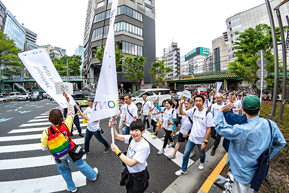 また、グループ全体で150名の役員、社員および社員のパートナー、家族などがプライドパレードに参加し、おそろいのPrideロゴのTシャツを着て、うちわを掲げて渋谷・原宿を行進しました。詳しくはこちら