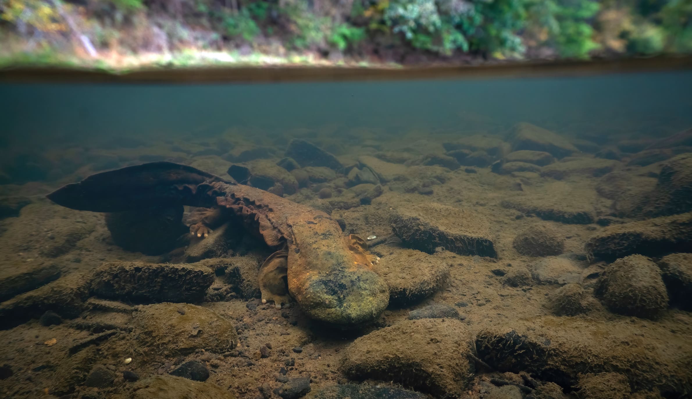 成体のヘルベンダーが、ペンシルベニア州のグラント・タウンシップのコミュニティによって守られている川の流域を歩き回っている様子。