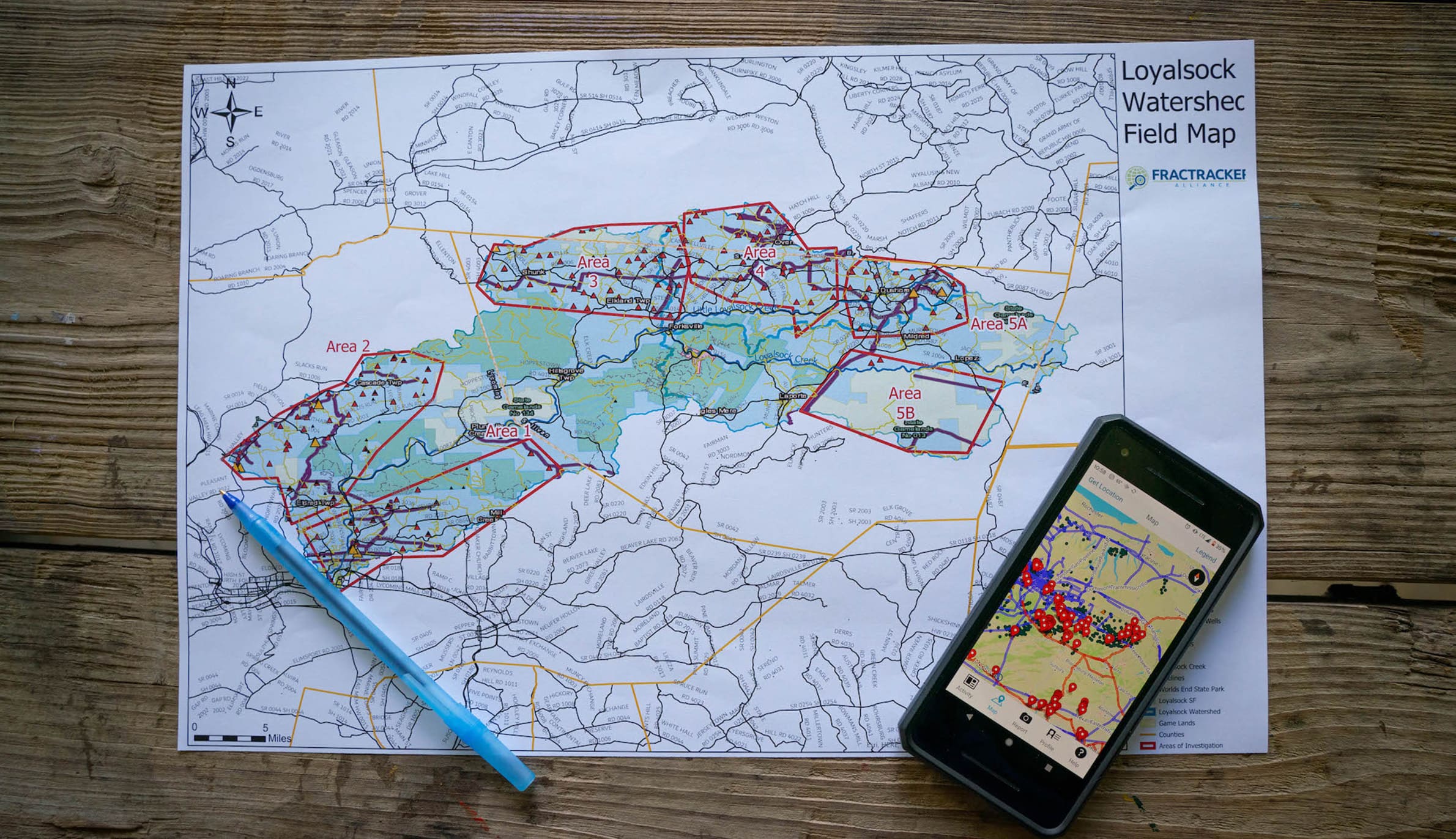 ペンシルベニア州のロイヤルソック川流域を通るパイプラインの地図。ガスや石油会社は多くのインフラを私有地に建設するため、通常は建設場所を公開しない。しかし、一度問題が発生すると、そのインフラは地域全体に悪影響を及ぼす可能性がある。「FracTracker Alliance」は携帯電話を利用したアプリケーションを活用し、インフラの建設場所の情報公開に取り組んでいる団体である。