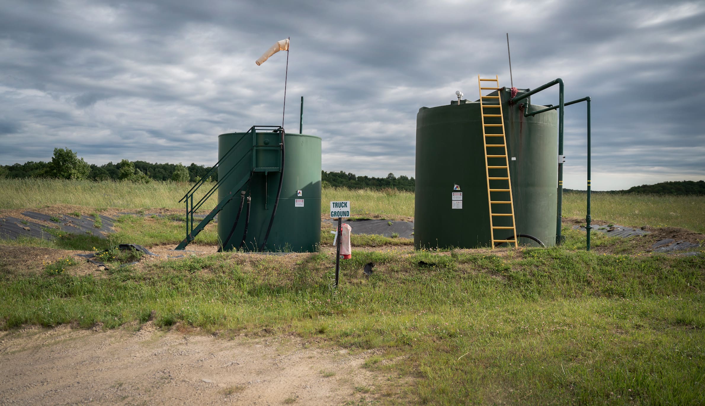 掘削現場の隣にある2つの液体貯蔵容器。これらの容器は、石油やガスを採掘する過程で使用される液体を保管するために使われている。