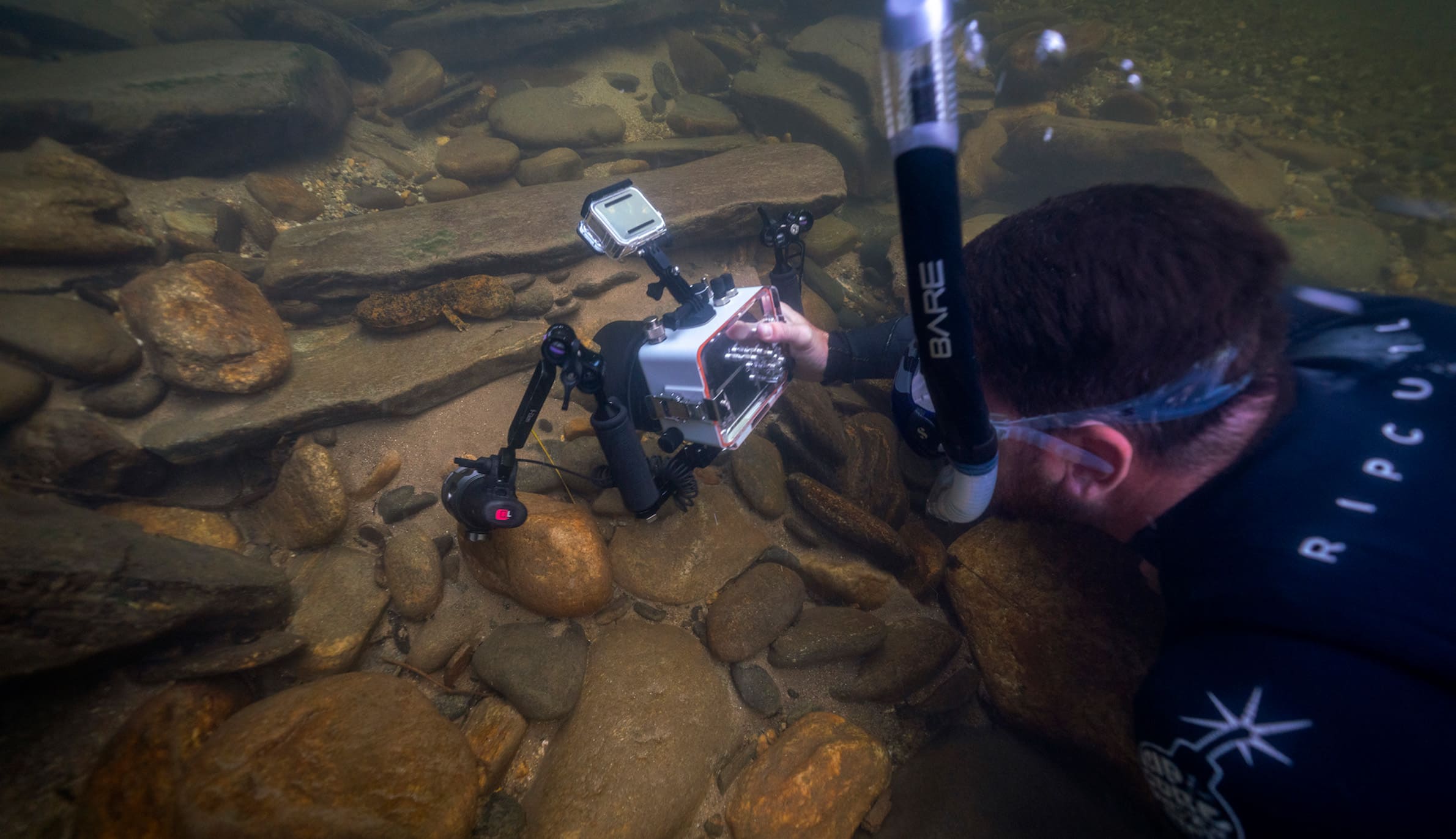 共同監督、プロデューサー、シネマトグラファーのジャスティン・グラブが、水中カメラを使って代表的なヘルベンダーの生息地を撮影している様子。