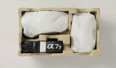 フルサイズミラーレス一眼カメラ「α7 IV」では、カメラ本体の包装に使用していたプラスチック系不織布袋を植物性のセルロースを主とした不織布袋※1に変更、バッテリーやケーブル等に使用していたポリ袋も同じく植物性セルロースを主とした不織布袋※1、もしくは紙袋を採用しました。ストラップを束ねる帯やケーブル類を束ねるバンドもそれぞれプラスチックから紙製に変更しています。今後も個装プラスチックの更なる削減を目指していきます。