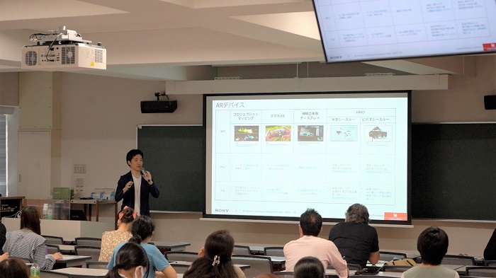 6月には文化庁助成事業「大学における文化芸術推進事業」での公開講座で、ソニーの技術開発研究所のXRシステム技術開発部に所属する武田優生さんがXR(Extended Reality—エクステンデッドリアリティの略称、現実世界と仮想世界を融合し、現実では知覚できない新たな体験を創出する技術)について講演されました。XRに興味がある大学生そして高校生が参加、講義後の1時間のディスカッション後も有志が集まり議論が続くという、皆さんの熱意が感じられる会となりました。XR技術の価値・仕組み・応用例を知ることで、今まで専門ではなかった学生が、今後XRについて深堀するきっかけになったとのご意見をいただきました。