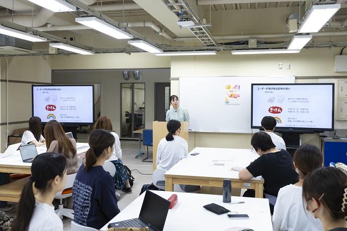 PTC 商品設計第7部門の岩瀬綾子さんは、ユーザーのニーズに合わせて設計を進める人間中心設計について、身近な事例を踏まえての講演でした。二児の母でありエンジニアというお立場である岩瀬さんからは、就職しても常に学び続けている自分の姿を子どもも見て育っている、大学は学ぶ姿勢を学ぶ貴重な場としてほしいというご意見に、学生も納得の表情を浮かべているようでした。機器や装置を使う人の仕事を観察したり弟子入りしたりまでされるという徹底された内容に学生からは驚きの意見や、人間工学とも結びつくお話しに、分野のつながりを実感できたという声もありました。