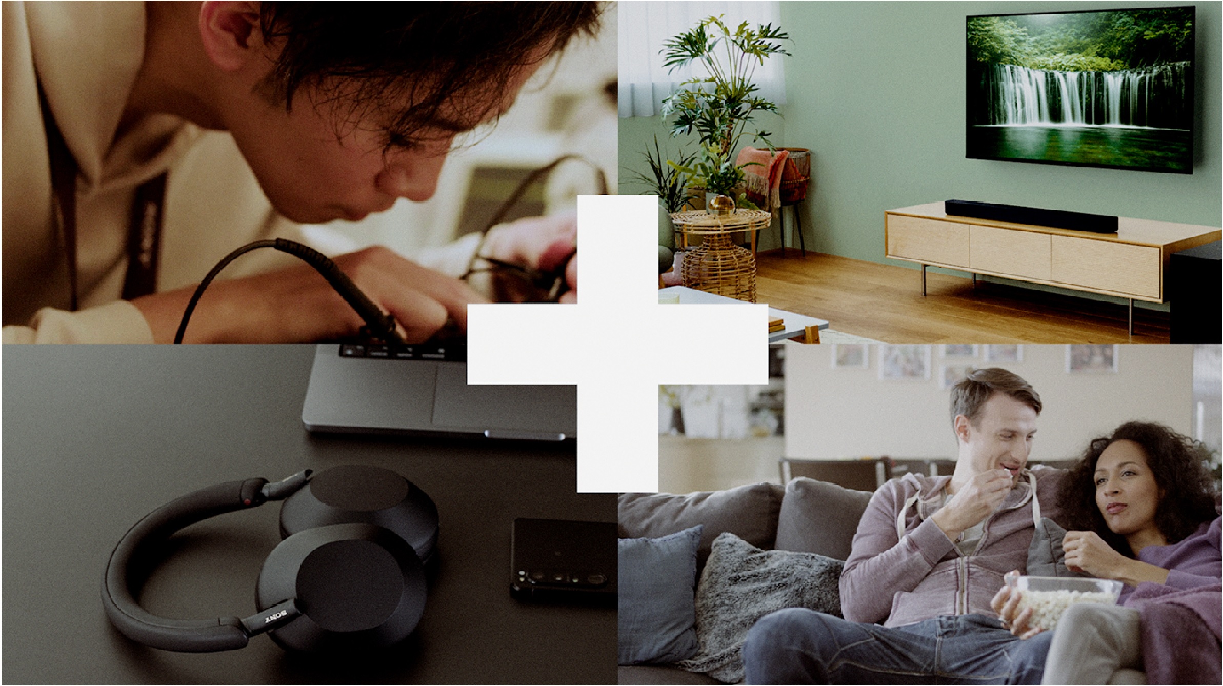 «4分割の画面。左上には手元を覗き込んで作業する男性、右上は壁掛けテレビのある部屋、左下に机の上のヘッドホン、右下にソファでくつろぐ男女が映っている。中央に白いプラスマーク。その左右にも並んでいるプラスマークの一部分が見えている。