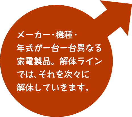 手作業で解体するため「一台ごとに異なる家電製品をいかに効率よく解体するか」が重要なポイントです。豊富な経験を持った作業者は、どんな家電製品でも素早く、正確に解体していきます。工場見学ではその熟練の早ワザに注目してください!