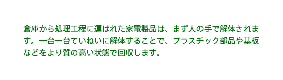 倉庫から処理工程に運ばれた家電製品は、まず人の手で解体されます。一台一台ていねいに解体することで、プラスチック部品や基板などをより質の高い状態で回収します。