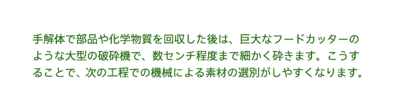 手解体で部品や化学物質を回収した後は、巨大なフードカッターのような大型の破砕機で、数センチ程度まで細かく砕きます。こうすることで、次の工程での機械による素材の選別がしやすくなります。