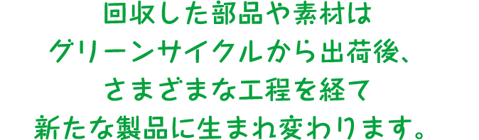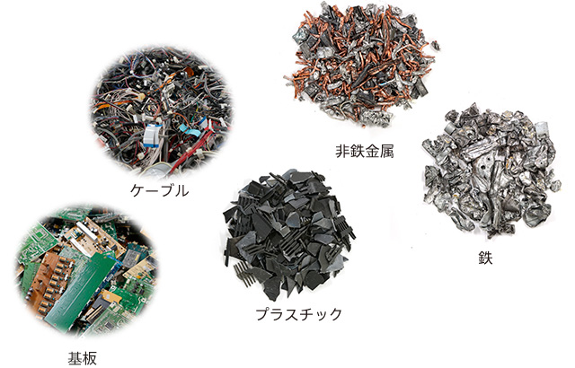 手解体によって回収された基板やケーブル等の部品に加え、機械で選別された鉄、非鉄金属(銅・アルミ)、プラスチック(ポリプロピレン、ポリスチレン・ABS樹脂)等の素材は新たな資源の素になります。