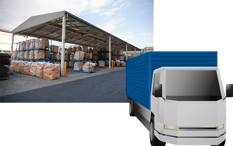 運ばれた製品は計量後、倉庫に積み上げて保管。コンテナ約150基を1日で処理します