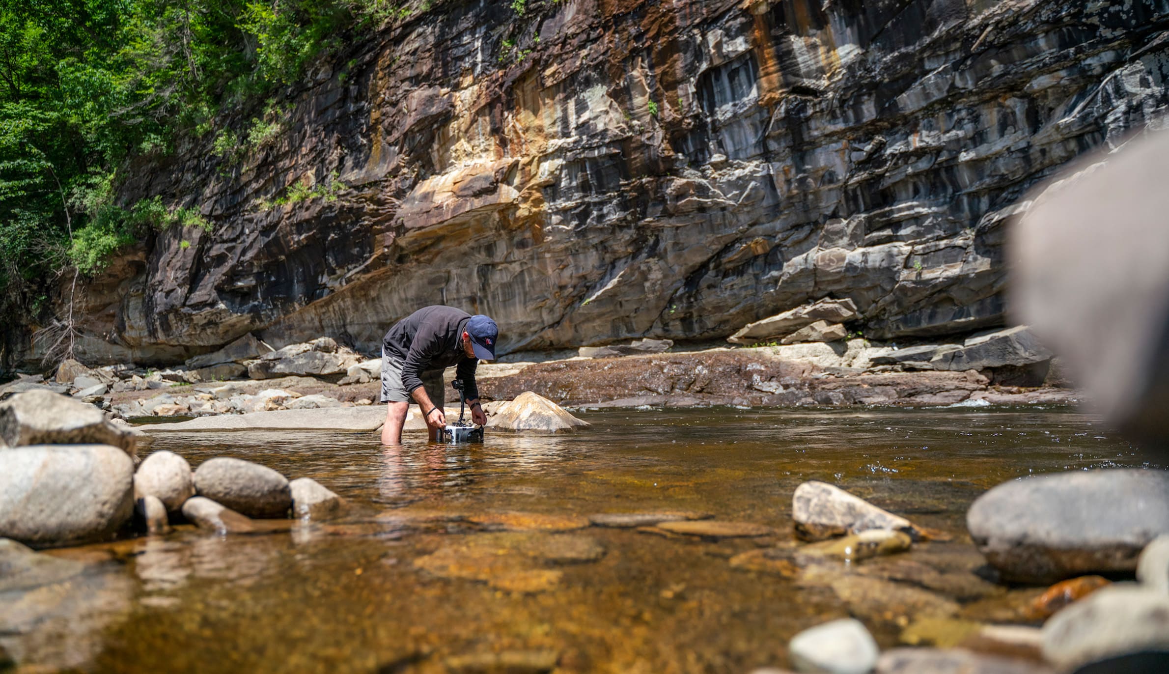 Co-director, Producer and Cinematographer Justin Grubb filming typical hellbender habitat with an underwater camera.