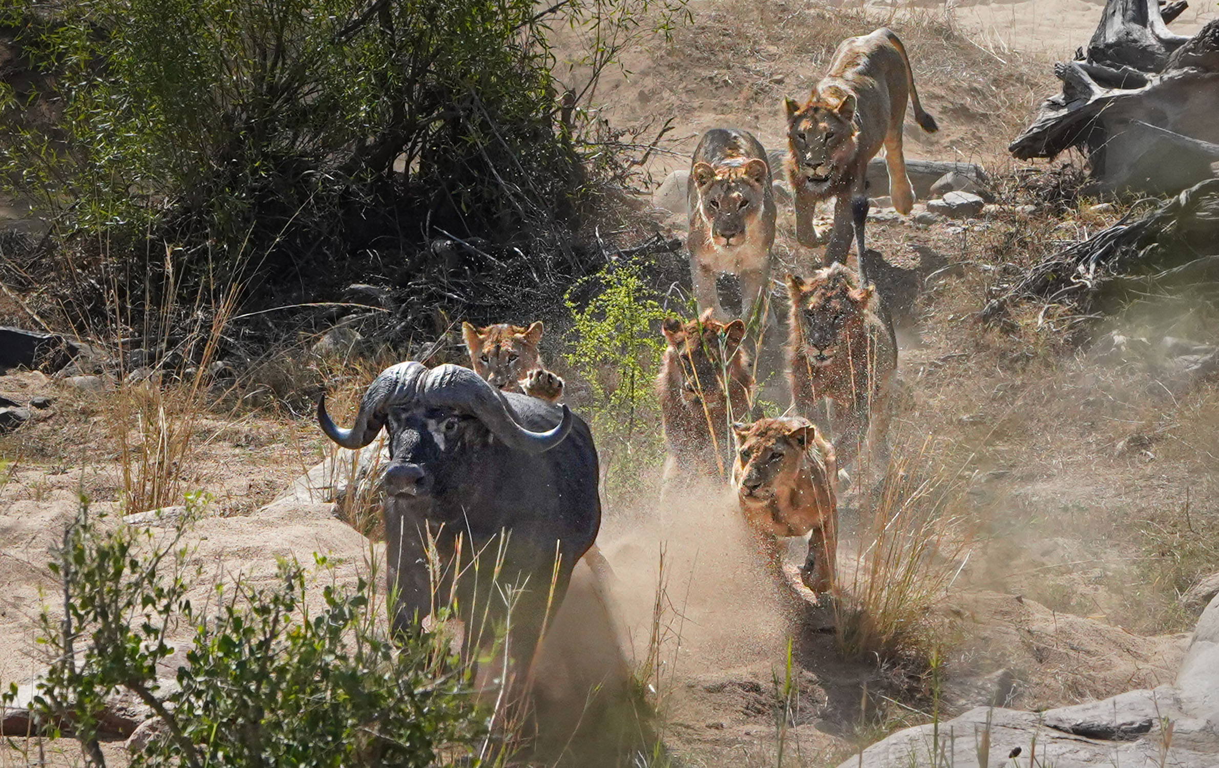 The most memorable picture I took was of the first hunting scene I ever witnessed. An aging buffalo, likely with poor eyesight and sense of smell, accidentally wandered too close to a family of lions sleeping by a river. I vividly remember every detail, including how they went into hunting mode and the explosive burst as they sprang into action.
