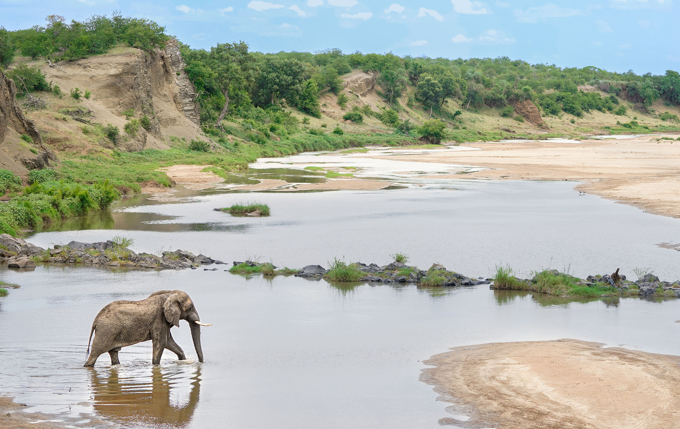 An elephant crossing a river. Elephants sometimes get injured when caught in poaching traps.